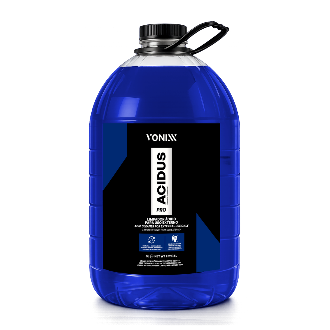 Acidus Pro 5L da Vonixx é um limpador ácido concentrado desenvolvido para remover sujeiras minerais, oxidação, barro impregnado e contaminações difíceis presentes em rodas, chassis, caixas de roda e superfícies externas do veículo.