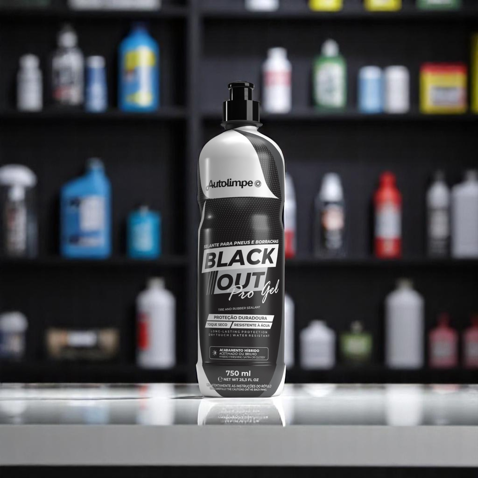 O BLACKOUT PRO GEL é um selante revitalizador com alta durabilidade desenvolvido para formar uma camada protetora com brilho acetinado em borrachas, pneus, tapetes, frisos, maçanetas, capotas, lonas marítimas, peças plásticas externas e pisos paviflex.
