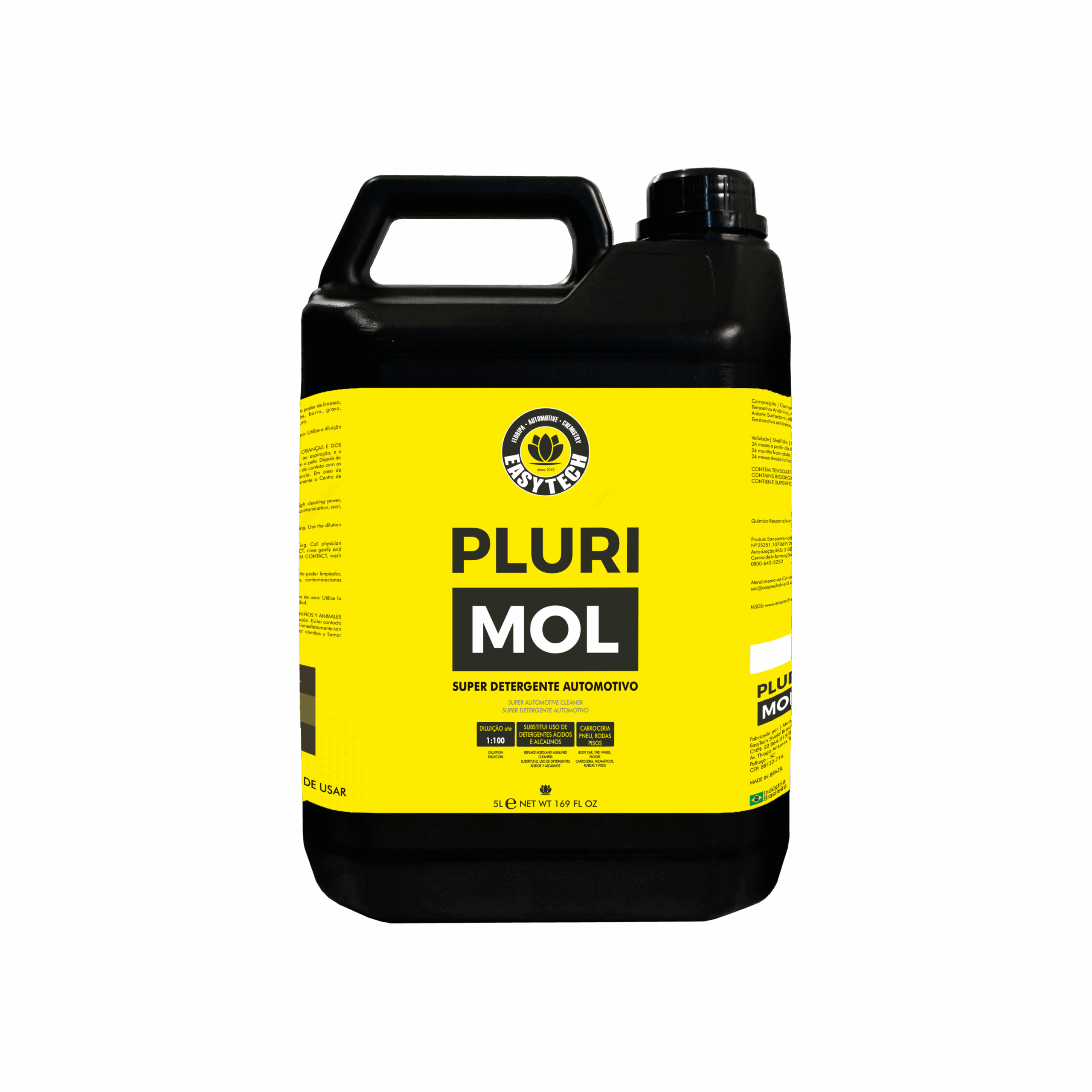 Desincrustante ácido, desengraxante alcalino, detergente e descontaminante ferroso em 1 unico produto. Este é o PLURI MOL. Um produto revolucionário, capaz de substituir o uso de produtos ácidos e alcalinos no processo de lavagem pesada. Pluri MOL é 4 em 1: penetra e desprende sujeiras pesadas, contaminação ferrosa, fuligem, óleos e gorduras. Perfeito para remoção de barro, pintura amarelada, limpeza de motor, caixa de roda, fuligem. PLURI MOL faz o que nenhum outro produto MOL no mercado faz. Diga adeus ao uso de detergentes ácidos e super alcalinos. Para qualquer tipo de sujeira, basta escolher a diluição adequada, com bastante segurança. Pluri MOL é tão versátil que pode ser usado para limpeza de rodas, pneu, vidros, pintura automotiva, pisos. Sua capacidade de desprendimento de sujeira é impressionante.